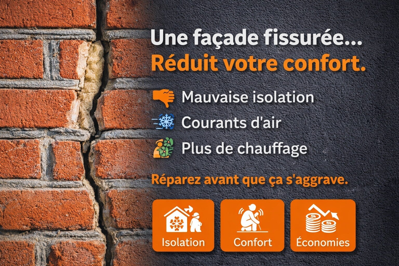 Les fissures permettent à l’air froid, à l’eau et à l’humidité de pénétrer dans les murs. Avec le gel et le dégel, elles s’agrandissent et fragilisent la structure.